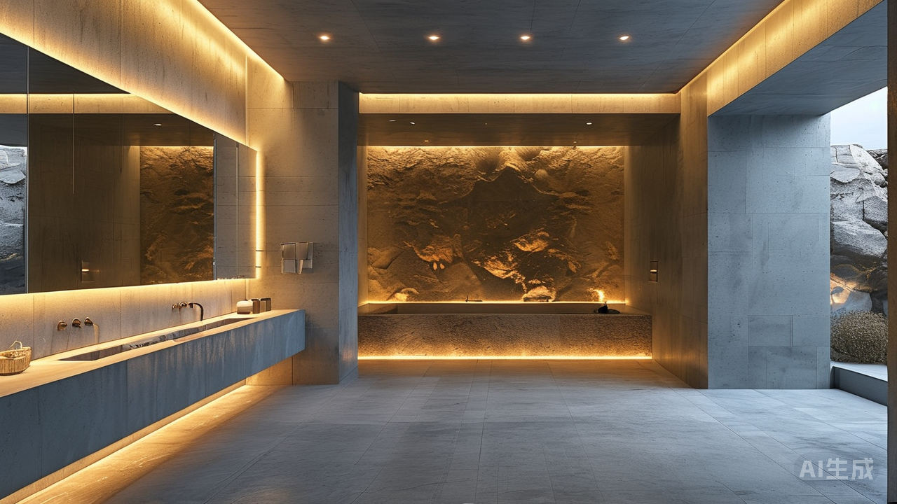 沐浴区延续了这份低调的奢华。独立式浴缸静卧在窗畔,流畅的弧线成为空间优雅的点缀。透明玻璃隔断的淋浴房内,墙面岩板以更具雕塑感的拼接方式延伸,水流滑过那温润致密的表面,更添一份私密的宁静与放松。每一处细节,从精致的龙头到隐藏式地漏,都在无声中强化着整体空间的纯粹与高级。 这并非简单的盥洗空间,而是融合了体贴功能与艺术美学的轻奢栖所。双人盥洗台让亲密时光互不侵扰,超大岩板则以无声的磅礴气韵铺陈出空间的骨架与灵魂。在这里,日常的洗漱升华为一种充满仪式感的沉浸式体验——在温润如玉的触感与流动的光影间,每一次踏入,都是对身心的一次温柔犒赏,让生活回归应有的精致与从容。 文字中通过连贯的场景描写和具象化的感官细节(如“冰凉与坚实”、“暖金色的涟漪”、“水流滑过温润致密的表面”等)自然融入了双人盥洗区功能与岩板特性,避免了列表式的说明,营造出沉浸式的轻奢空间体验。 |