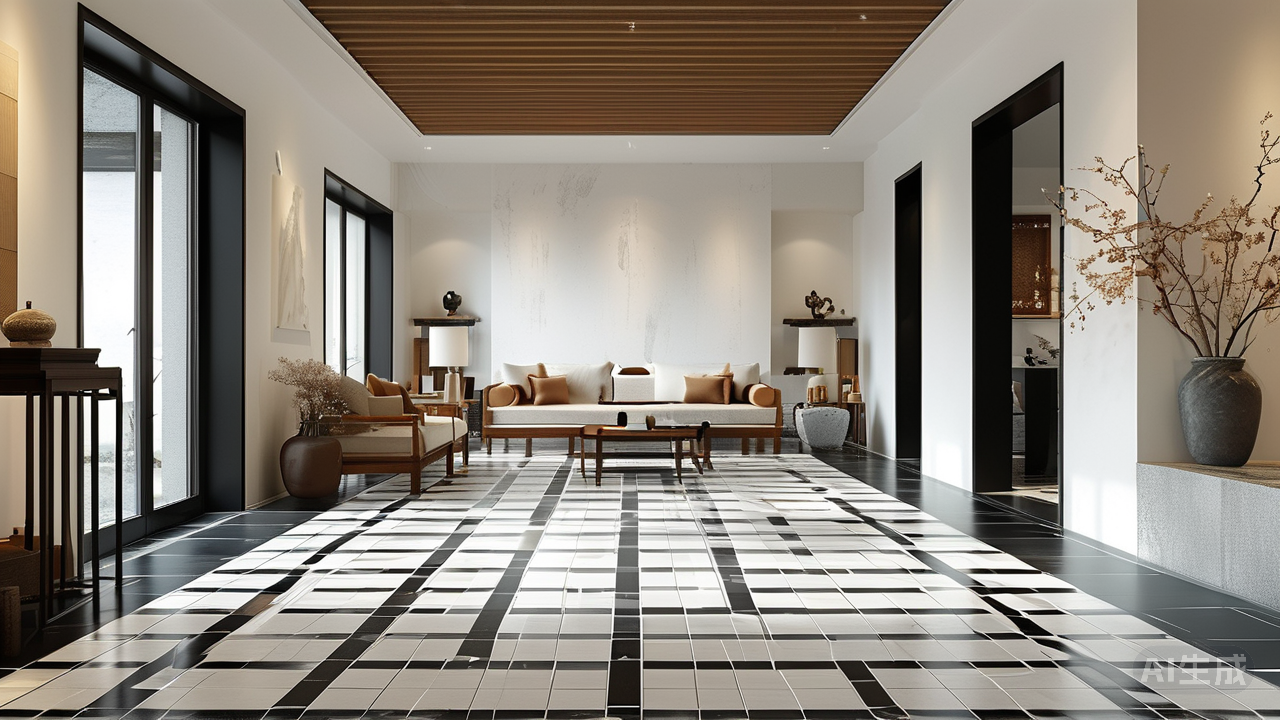 墨韵与留白:如何在空间中运用黑白对比色瓷砖演绎新中式风骨当东方美学的魂灵叩问现代居住空间,黑白两色瓷砖便如宣纸与浓墨,在方寸之地悄然铺就一场新中式的呼吸。深沉的玄关处,几片墨黑瓷砖斜斜铺展,如古砚凝墨欲滴,其肌理或如斧劈山石,或似墨分五色,隐隐透出坚韧之骨。光拂过哑光的表面,宛若暗涌的江涛,使玄关自成一方天地,深邃如诗,悄然为归人拂去浮尘。 循着空间的脉络而行,清朗的白砖铺展开来,如云气漫卷过道,仿佛宣纸之上未曾落墨的留白。瓷砖缝隙,设计者以极细的黑色勾缝轻轻勾勒,似装裱古画时精准的绢绫接裱之痕——既约束着边界,又默默为纯白添一份清隽的筋骨。光于此流淌,白砖表面泛起柔和暖意,如同晨光初照雪原,澄澈中自有包容万象的沉静。