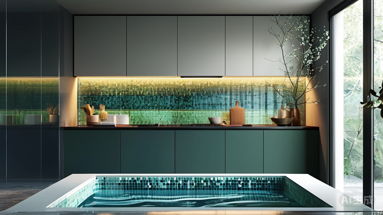 厨房里,故事浸染了烟火气息。光洁的白色砖墙映照着忙碌身影,而地面则别有洞天。灶台与水槽前,一方深沉的蓝黑色哑光砖如静水深潭,沉稳承接飞溅的水滴与油星,沉稳如基石;稍远处,浅灰砖色渐次明亮铺展,似烟霭弥漫,温柔拥抱整个空间。这一深一浅的色调渐变,宛如厨房交响曲的节奏起伏,无声指挥着烹饪韵律的流转。 目光滑向浴室,视觉的叙述陡然变得幽微而充满流动的诗意。浴缸边缘,一圈剔透的蓝绿玻璃马赛克小砖精心镶嵌,宛如碧水初凝。这些晶莹碎块沿着湿区地面,竟渐渐舒展、弥散开来,幻化为一片荡漾的水波纹理——人行走其上,砖纹随光影摇曳,仿佛踏在清浅溪流之中,触目皆是水波流转,每一步都似踏入清凉梦境,静谧而灵透。