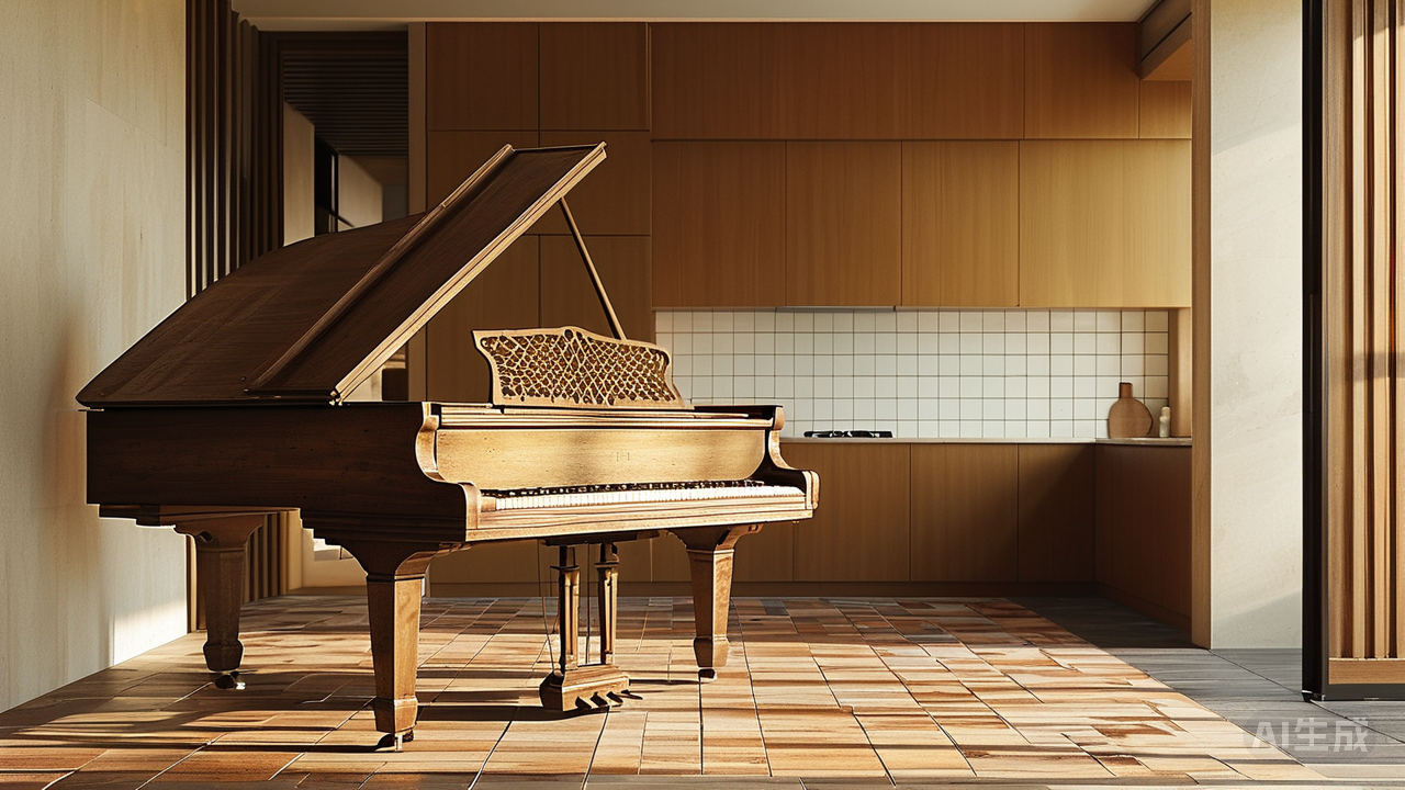 行至客厅,那自玄关延伸而来的花砖小径,渐渐汇入一方更开阔的天地。暖黄柔光之下,大片温润的木纹砖舒展铺开,木头的肌理和暖意被凝固于此。而那条花砖路径并未中断,它低调地演变为一道细细的深棕边带,似墨线勾勒,游走于沙发边、矮柜旁,最终悄然止步于那架老旧的三角钢琴脚边——琴声悠扬时,这砖线便化作无声的谱线,与岁月一同震颤。